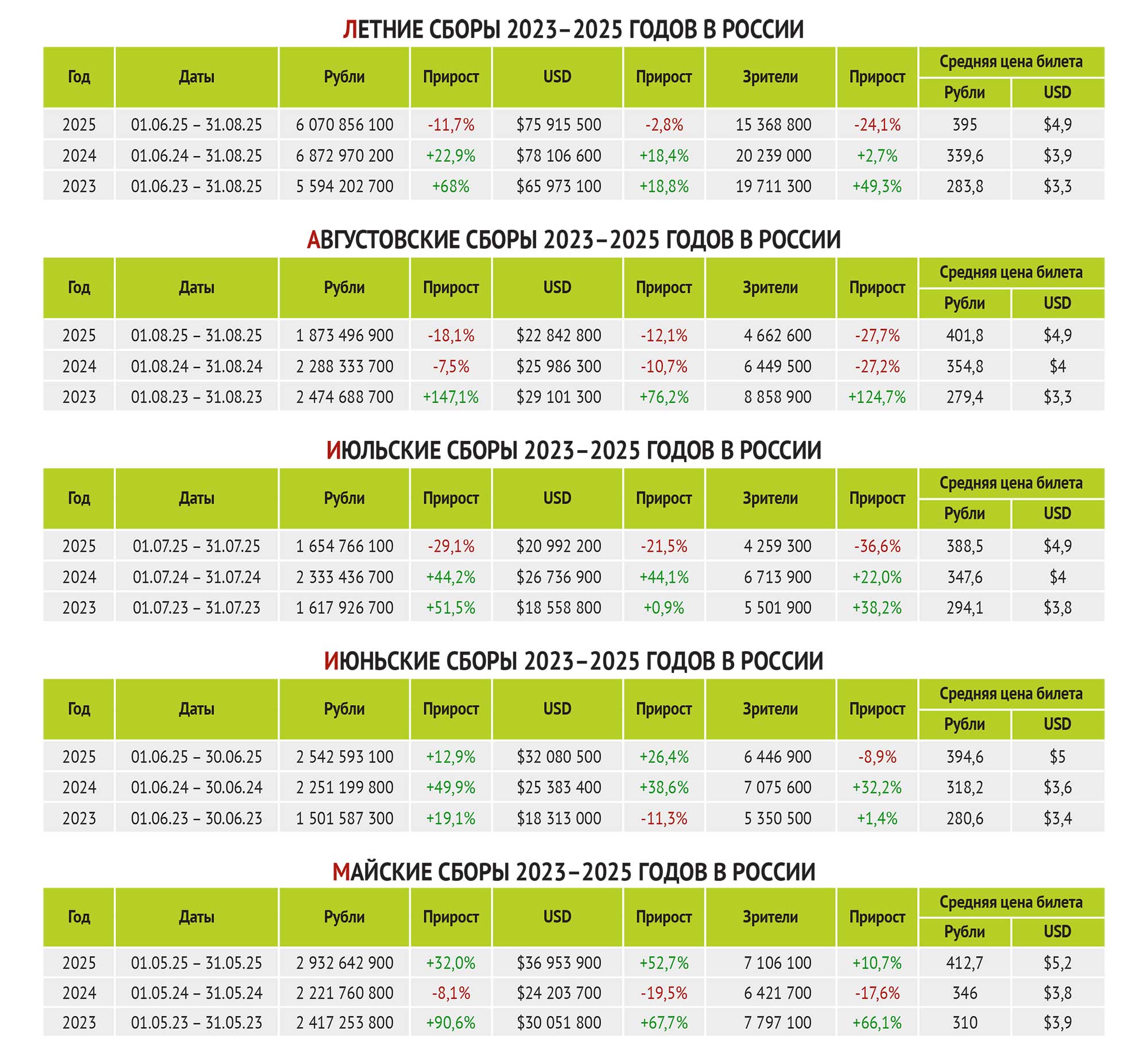 В июне благодаря расширенному праздничному уикенду еще можно было увидеть крупные российские премьеры. Однако в июле и августе катастрофическая ситуация сложилась окончательно. Это подтверждают и графики по отдельным месяцам. В июне падение в зрителях относительно 2024 года составляло лишь 8,9%, в июле и августе оно достигло значительно более высоких отметок – 36,6% и 27,7% соответственно. В целом сборы кинотеатров этим летом, по данным БК, едва превысили 6 млрд рублей, хотя годом ранее достигали 6,9 млрд. Самым слабым месяцем в году оказался июль с его 1,7 млрд, и при этом он показал падение к 2024-му на 29,1%. В целом можно уверенно говорить о том, что после провального прошлогоднего лета индустрия не только не провела работу над ошибками, но и усугубила ситуацию.