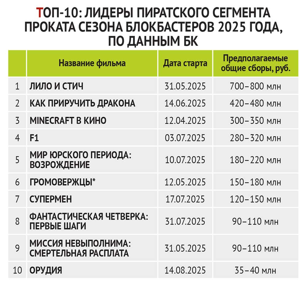 Несомненно, если бы все перечисленные проекты выходили на всех площадках страны и с мейджорской рекламной кампанией, то их сборы оказались бы на порядок выше. Но даже в данном объеме именно Голливуд помог кинотеатрам пережить лето. За неимением крупного отечественного контента и в силу нежелания российских продюсеров ставить на лето свои блокбастеры показчики вынуждены прокатывать пиратский контент, сборы от которого к тому же полностью достаются им. Анонимный источник на рынке подтвердил БК пропорцию «пиратки» в сборах кинотеатров и то, какую роль она сыграла в условиях дефицита крупного российского продукта: «Доля альтернативного контента летом составила около 60 процентов. Соответственно, кинотеатры были поддержаны в большей мере именно таким контентом. Очень хорошо отработали ЛИЛО И СТИЧ, КАК ПРИРУЧИТЬ ДРАКОНА, F1, МИР ЮРСКОГО ПЕРИОДА, ФАНТАСТИЧЕСКАЯ ЧЕТВЕРКА. Также такие небольшие картины, как ОРУДИЯ, добавили нам количество зрителей. Еще в августе были перевыпуски старых фильмов, например, МСТИТЕЛЕЙ, ПИРАТОВ КАРИБСКОГО МОРЯ и других. Подобные показы тоже пользовались спросом. В общем, без альтернативного контента нам проще было бы закрыться, чем работать. Причем даже с учетом неплохого проката альтернативных релизов многие кинотеатры заходят в сентябрь с долгами».