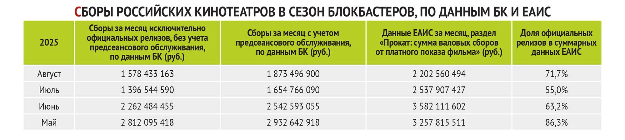 По этой таблице можно оценить разницу между тремя показателями: 1) сборами исключительно официальных проектов (данные БК, полученные от дистрибьюторов и из ЕАИС); 2) сборами официальных релизов в сумме со сборами короткометражных проектов, присутствующих в топе ЕАИС; 3) суммарными сборами от всех платных показов. Последняя цифра доступна исключительно на сайте ЕАИС в соответствующем разделе – и, как мы видим, она значительно выше оценки рынка, которую может предоставить БК.