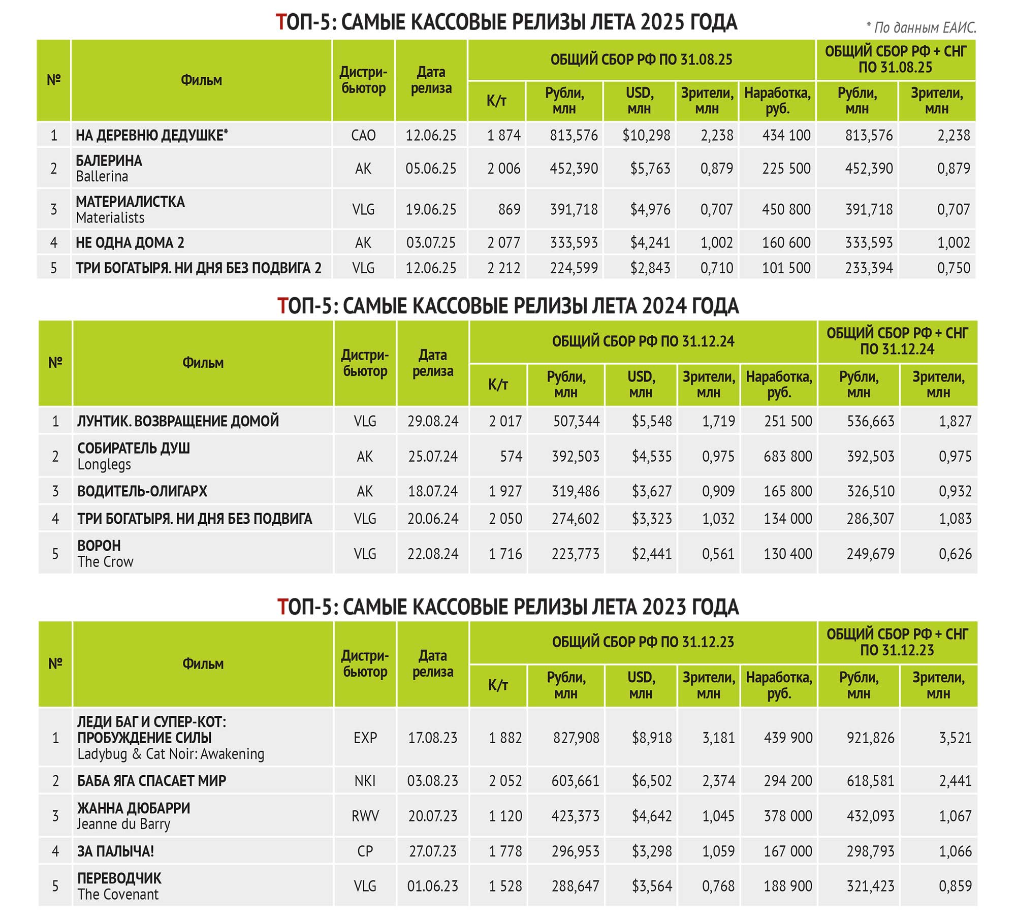 Руководитель отдела кинопроката сети «Синема 5» Людмила Яровикова следующим образом описывает последние три месяца жизни кинотеатров: «Итоги летнего сезона имеют отрицательную динамику по отношению к прошлому году. Этот июнь отработал чуть лучше прошлогоднего, июль и август – на 20 процентов хуже аналогичных периодов 2024-го. В целом по лету минус 10 процентов к прошлому году». Что касается лидеров проката, то, по оценке эксперта, количество крупных проектов сократилось еще больше. При этом НА ДЕРЕВНЮ ДЕДУШКЕ показывает, что российские ленты могут быть вполне успешными летом: «До старта фильма НА ДЕРЕВНЮ ДЕДУШКЕ наш прогноз был в пределах 100–150 миллионов рублей, но фильм выиграл в номинации «Прорыв года»: он беспрецедентно держался на больших экранах все лето и занимает шестую строчку по сборам за год. В итоге мы имеем пример работы фильма в летний период с отличными показателями. Все три месяца проект занимает первое-второе место по сборам. Смог бы он собрать такую кассу в холодное время года, имея конкурентов со схожей аудиторией? Вполне вероятно, что нет, публика разделилась бы. Кино остается одним из самых востребованных видов досуга, в том числе и летом. Все отдыхают, далеко не все куда-то уезжают, а даже если и уезжают, то возвращаются. Важно попадать в нерв аудитории, как это произошло с фильмом НА ДЕРЕВНЮ ДЕДУШКЕ, пример и перспективы адекватных цифр на летний период есть. Качественный контент в комедийном жанре или фильм, рассчитанный на детско-семейную аудиторию, плюс грамотная рекламная кампания – и проект найдет своего зрителя летом. Ждем ХОЛОПА 3 следующим летом, я думаю, у него есть все шансы возглавить летний прокат 2026 года, сломать стереотипы и закрепить новый прокатный сценарий на летний период».