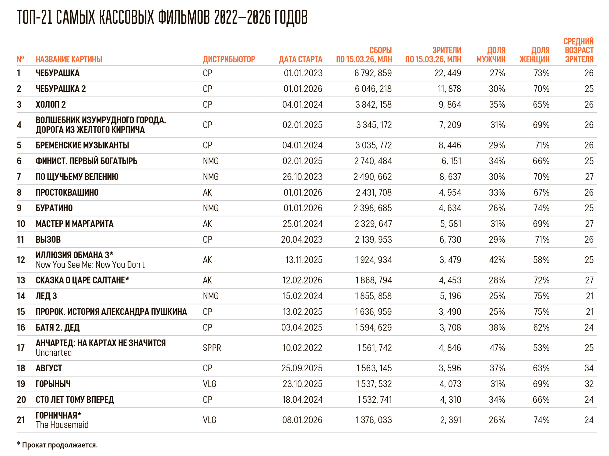 Одним из главных событий первых трех месяцев наступившего года в отечественном прокате стала сенсационная касса ленты ГОРНИЧНАЯ. Триллер Пола Фига стартовал в кинотеатрах еще в новогодние праздники с достойным результатом в 134 млн рублей, после чего на втором уикенде заработал даже больше, чем на старте. Благодаря волне обсуждений снижение сборов картины в следующие три недели не превышало 20%. К моменту празднования 8 Марта, когда картина уже ровно два месяца держалась среди лидеров отечественного проката, ее валовые сборы вплотную подобрались к отметке в 1,4 млрд рублей, то есть множитель проката достиг впечатляющего показателя 9,95. Для редакции БК это послужило поводом присмотреться к тому, как проекты, ориентированные на женщин, в данный момент чувствуют себя на больших экранах России.
