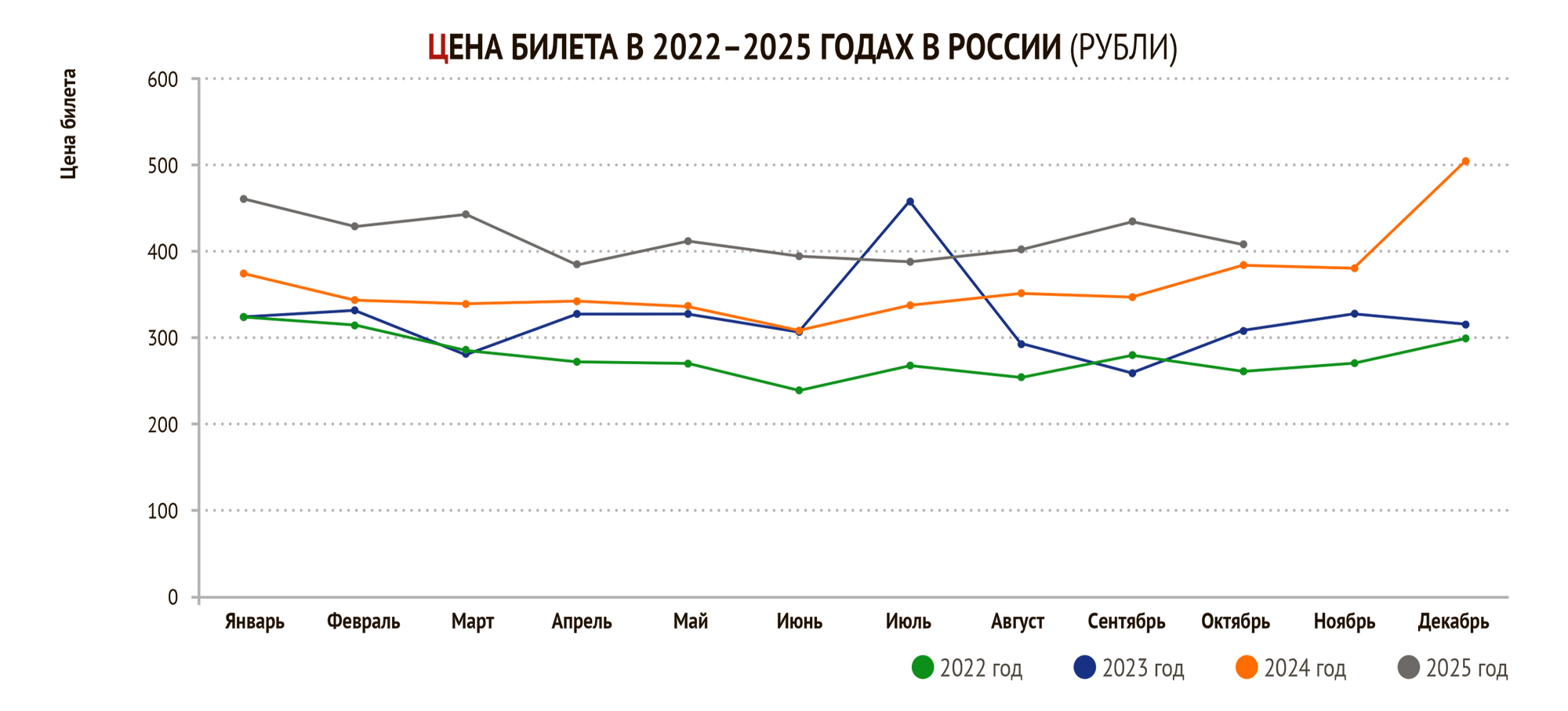 Если смотреть на отдельные месяцы, то уровень 2025 года был превышен только в рамках июля: в середине лета 2023 года поход в кино стоил 459 рублей. Также крайне высоким этот показатель был в декабре 2024-го (503 рубля) – но в этом случае мы еще не знаем, до какой отметки он доберется в 2025-м.